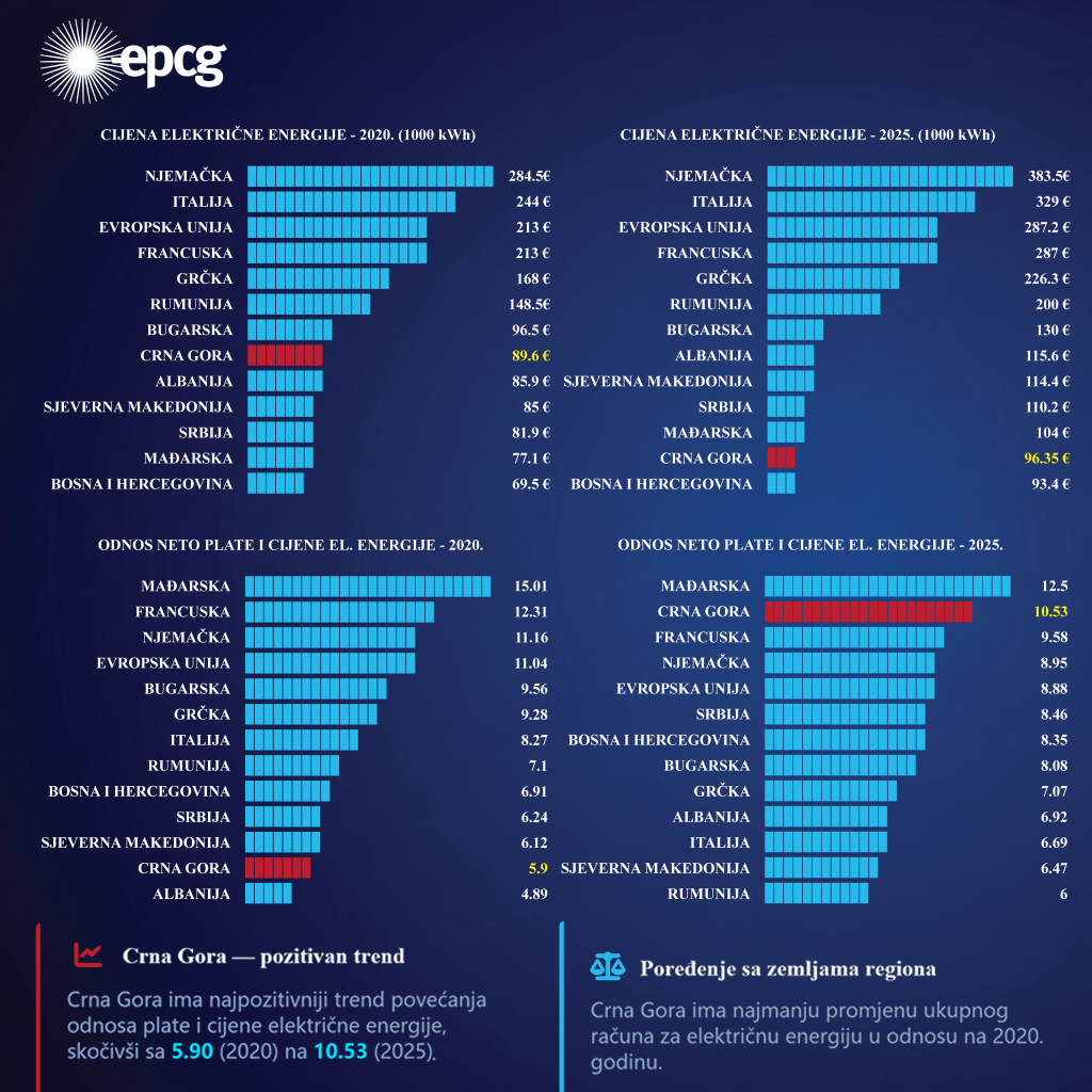 U poređenju sa zemljama regiona i najznačajnijim državama Evropske unije, Crna Gora ima najmanju promjenu ukupnog računa za električnu energiju u odnosu na 2020. godinu, uz istovremeno značajno poboljšanje odnosa plata i cijena električne energije.